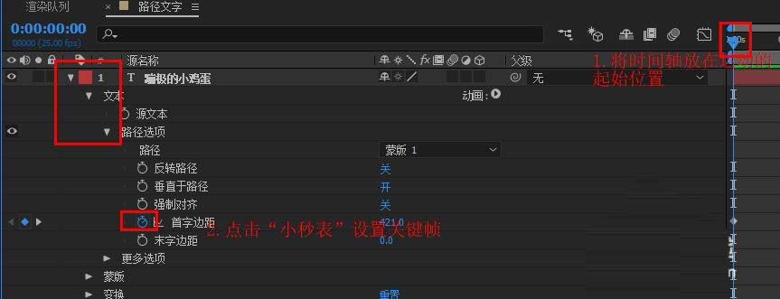 6、將時間軸放在文字運動路徑的起始時間點。點擊文本圖層前的小三角符號→文本前面的小三角符號→路徑選項前面的小三角符號。在出現的子菜單中找到”首字邊距“單擊前面的類似小秒表的圖標,設置起始關鍵幀