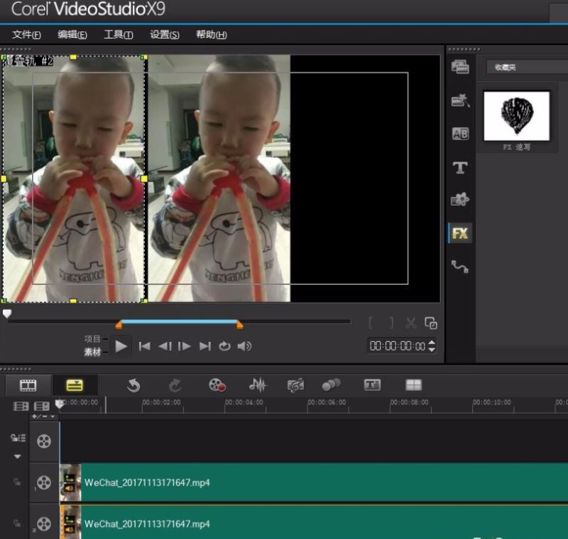 把復制好的視頻放到下面一個覆疊軌上,然后用鼠標調整大概位置,你還可以用鍵盤的上下左右鍵進行微調,