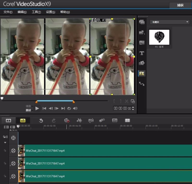 打開會聲會影X9,在覆疊軌內鼠標右擊,然后插入視頻,