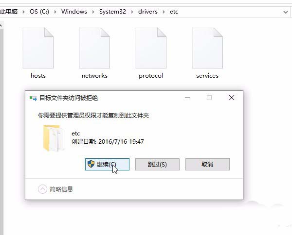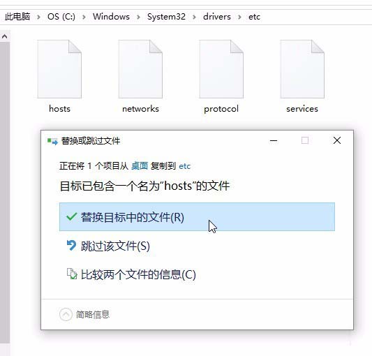 4、將修改后的hosts文件,復制,粘貼并替換掉C:/Windows/System32/drivers/etc目錄下的原文件,360會攔截,請放行,具體的看下面的截圖