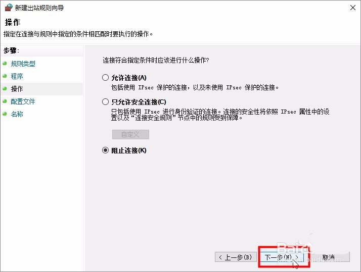 7、彈出下圖所示的窗口,默認勾選“阻止連接”,也就是阻止選擇的exe程序聯網。繼續“下一步”