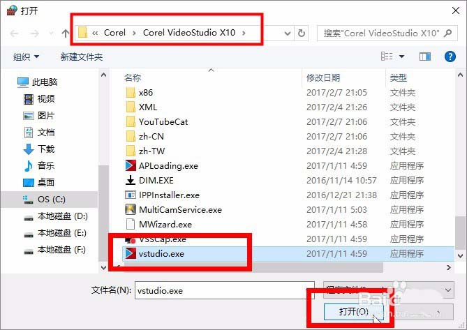 5、選擇會聲會影主程序(vstudio.exe),然后點擊“打開”