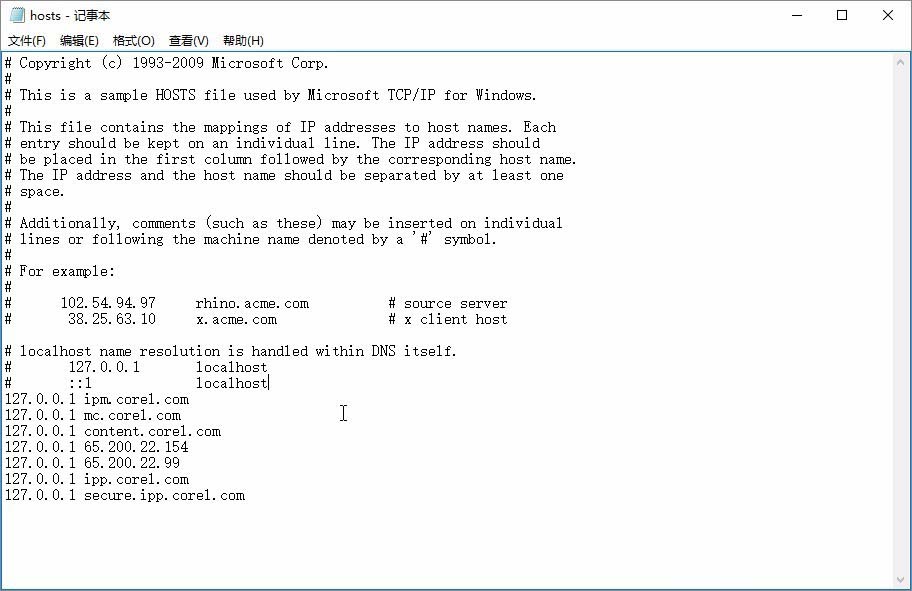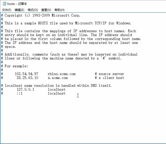2、用記事本打開已經復制到桌面的hosts文件,可以看到下圖所示的內容