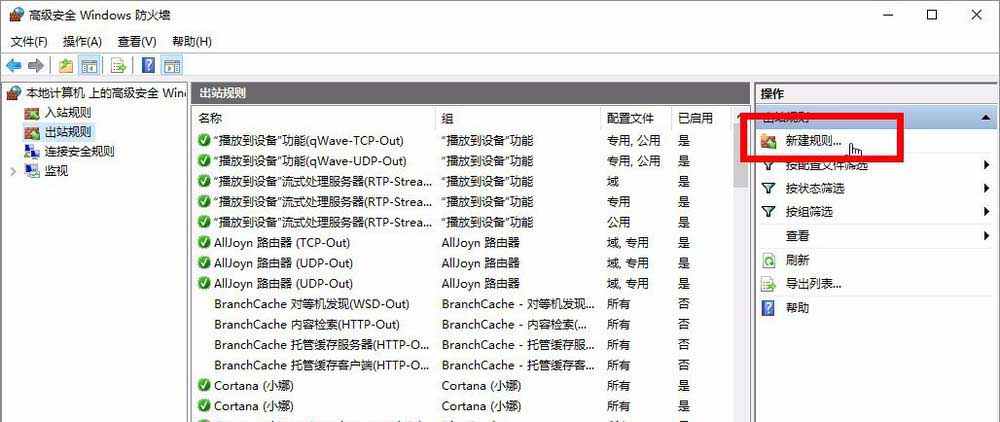 2、點擊左側欄的出站規則,然后可以看到右側的“新建規則”按鈕,點擊它