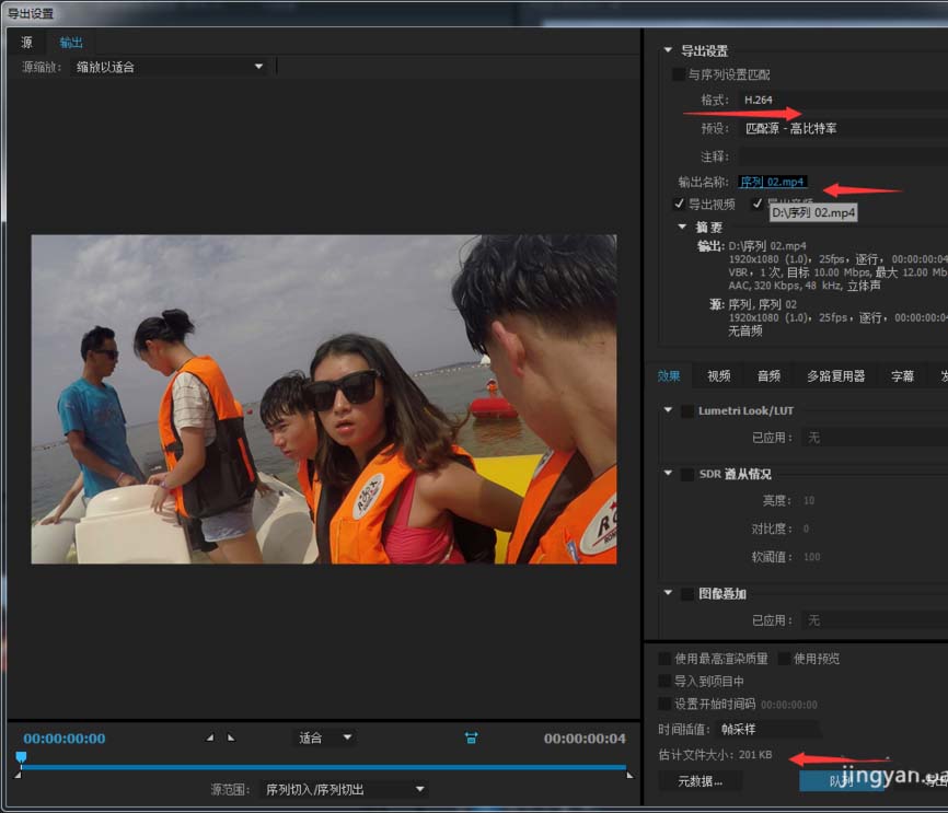6、最后大功告成,需要的就是導(dǎo)出了,就在導(dǎo)入的選項(xiàng)下面。導(dǎo)出的時(shí)候記得選擇格式一般MP4為主,就是選擇H.264,點(diǎn)擊導(dǎo)出名稱不光可以改名字,還可以選擇輸出位置,這一點(diǎn)對(duì)于新手來(lái)說(shuō)也很重要,經(jīng)常會(huì)找不到最后的視頻到哪了。