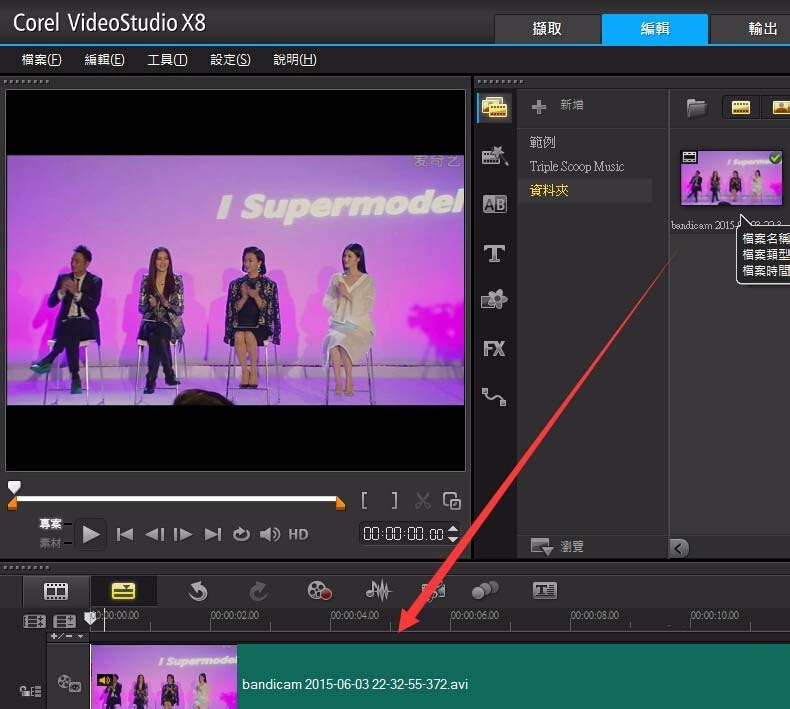 1、雙擊會聲會影X7,打開后,導入一段幾分鐘的視頻。拖拽到下面