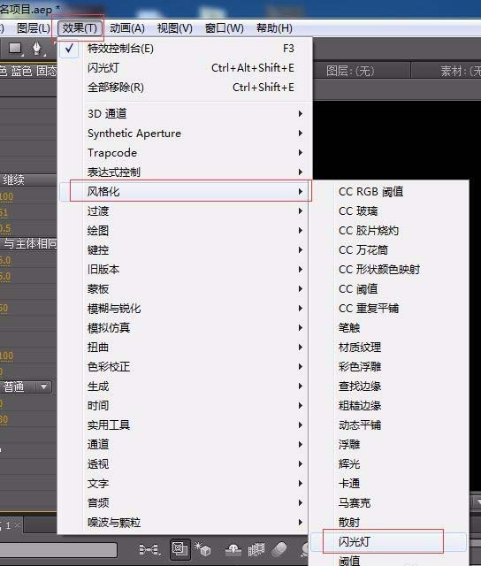 1、再給流星添加另外一個閃光燈特效。點擊效果/風格化/閃光燈。