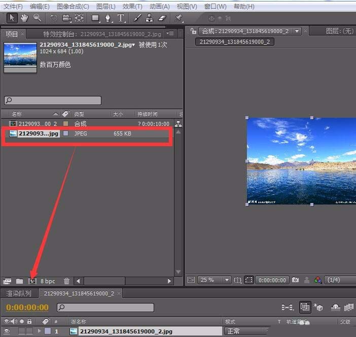1、打開AE軟件導入一張帶有水的圖片。鼠標左鍵按住圖片拖到新建合成,將這張圖片新建個合成。