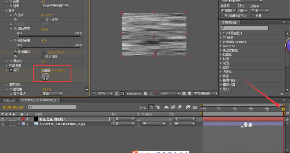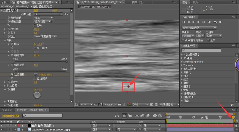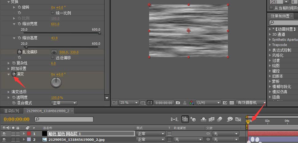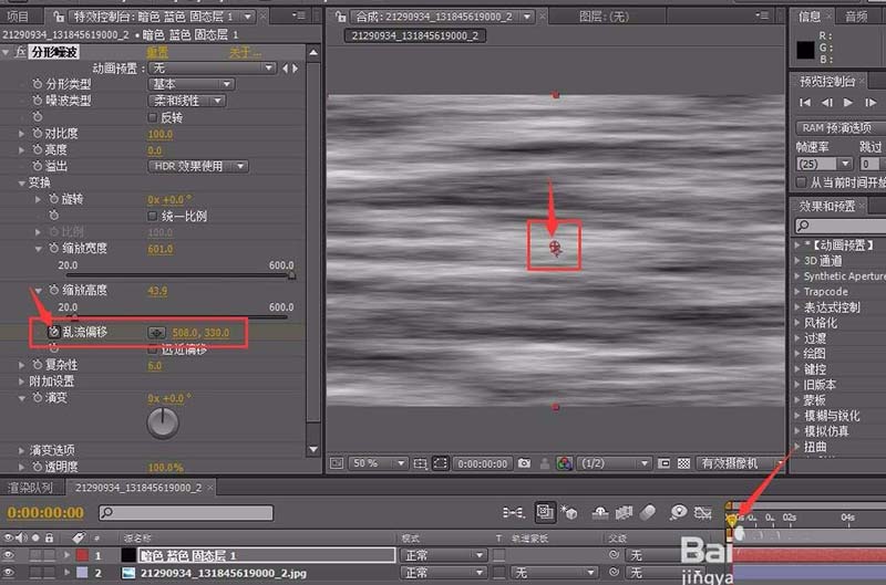 4、將時間滑塊拖至第一幀,將亂流偏移打上關(guān)鍵幀。中心點在窗口中間。然后再將時間軸拖至結(jié)束幀,將中心點拖至窗口底部。