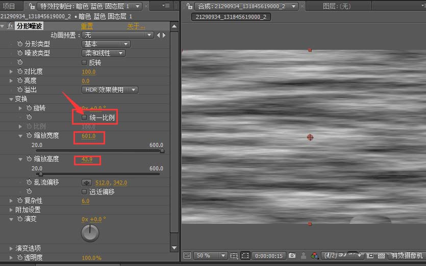 3、在分形燥波里,點開變換屬性,將同一比例的對勾去掉,再將縮放寬度調(diào)至600,將縮放高度調(diào)至40左右。