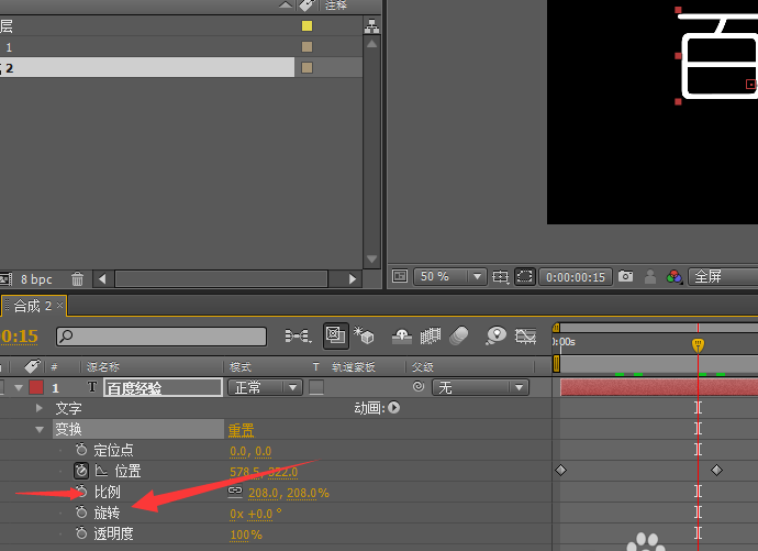 4、除此之外,文字的其他屬性也可以做動畫,比如,旋轉、比例,都可以,大家嘗試一下!