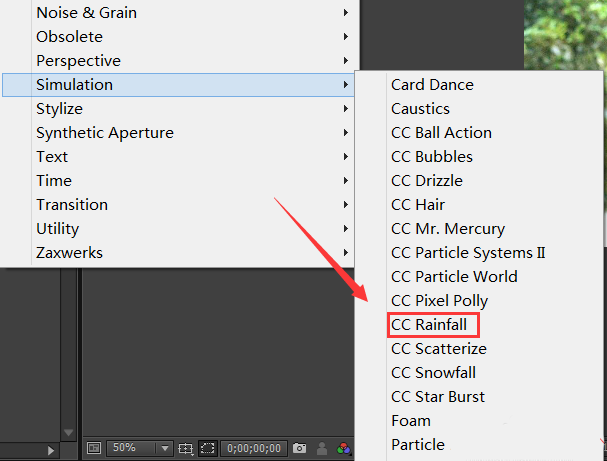 5、點(diǎn)擊simulation選項(xiàng)在其子級(jí)菜單里找到CC rainfall選項(xiàng),如圖所示: