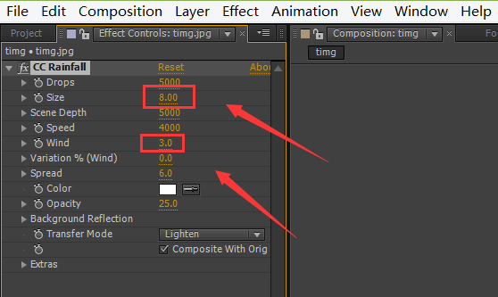6、點(diǎn)擊CC rainfall選項(xiàng)在特效面板里設(shè)置參數(shù)如圖所示: