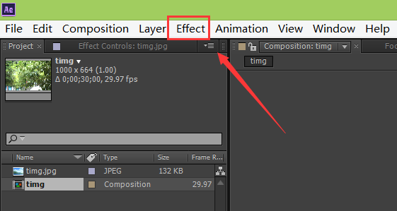 3、打開(kāi)圖片后創(chuàng)建一個(gè)新的合成,然后在菜單里找到effect菜單,如圖所示: