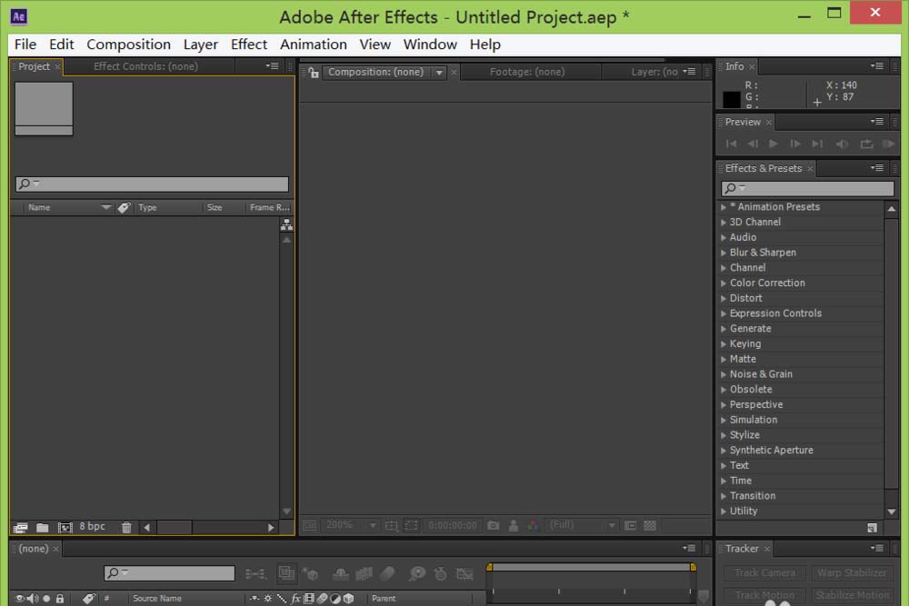 1、打開(kāi)AE這款軟件,進(jìn)入AE的操作界面,如圖所示: