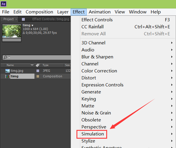 4、點(diǎn)擊effect菜單,在其子級(jí)菜單里找到simulation選項(xiàng),如圖所示: