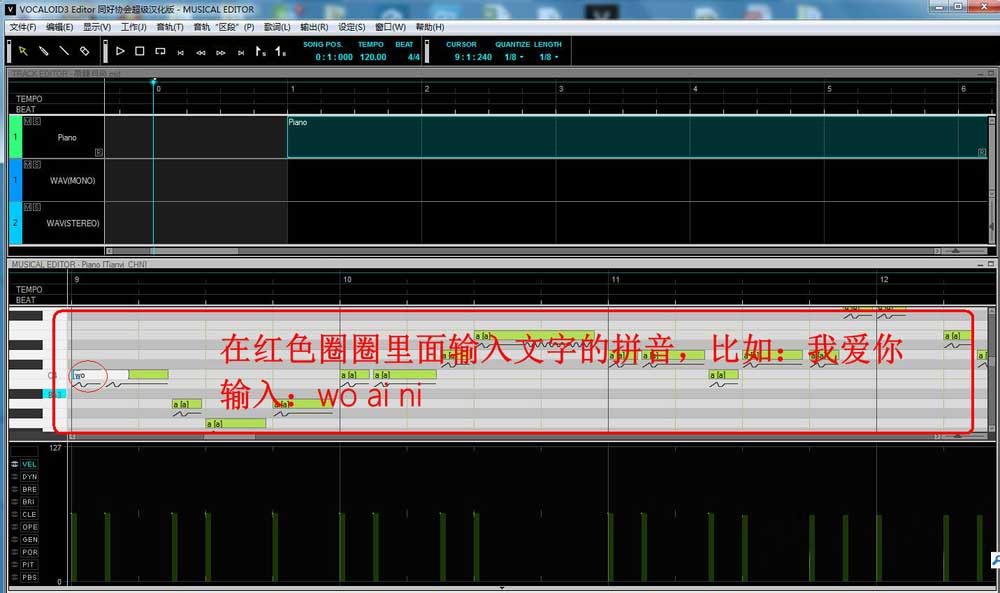 19、把MIDI文件導(dǎo)入后我們可以在畫面上看到音符了,在音符上面雙擊鼠標就可以進行唱詞編輯,用拼音的方式把歌詞輸入就可以進行簡單的演唱了,好好把玩吧我的朋友們。對了,如果感覺好用一定要支持正版哦。