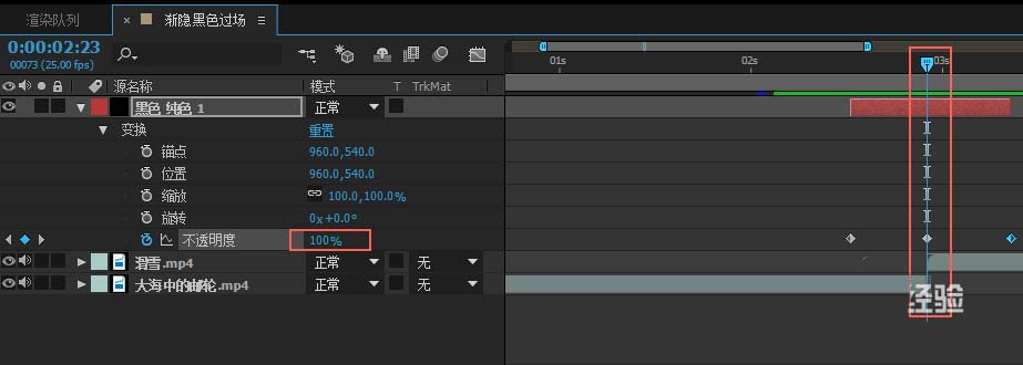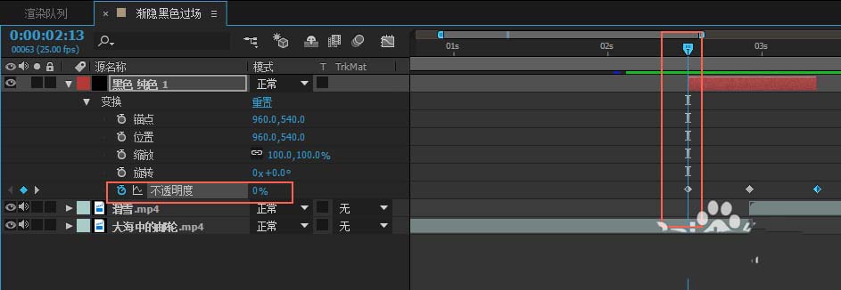 5、單擊純色圖層前面的小三角圖標單擊【變換】按鈕,給【不透明度】打上關鍵幀;視頻交叉處的【不透明度】設置為100%、兩端設置為0%。這樣一個簡單的“ 制作完成了;