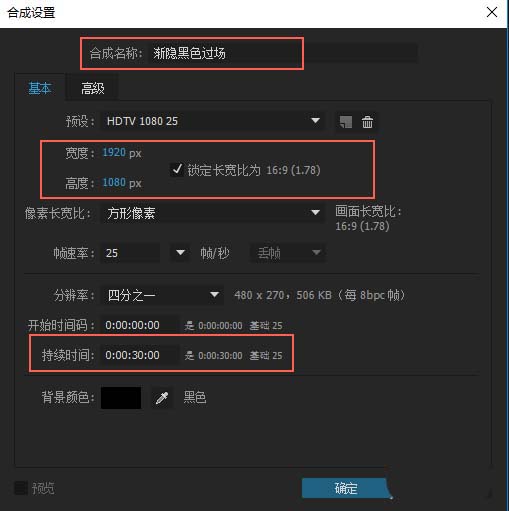 2、打開AE新建項目并新建合成,設置合成的名稱為“漸隱黑色過場”,設置畫面的大小為1920*1080,畫面的持續時間為30秒;