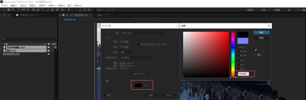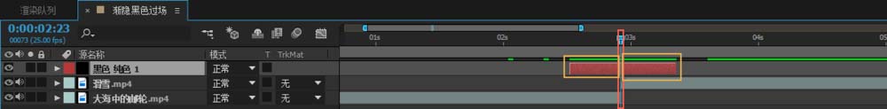 4、CTRL+Y新建一個純色圖層,設置圖層的顏色為黑色;截斷純色圖層,使得純色圖層在視頻相連處各出入10幀左右;