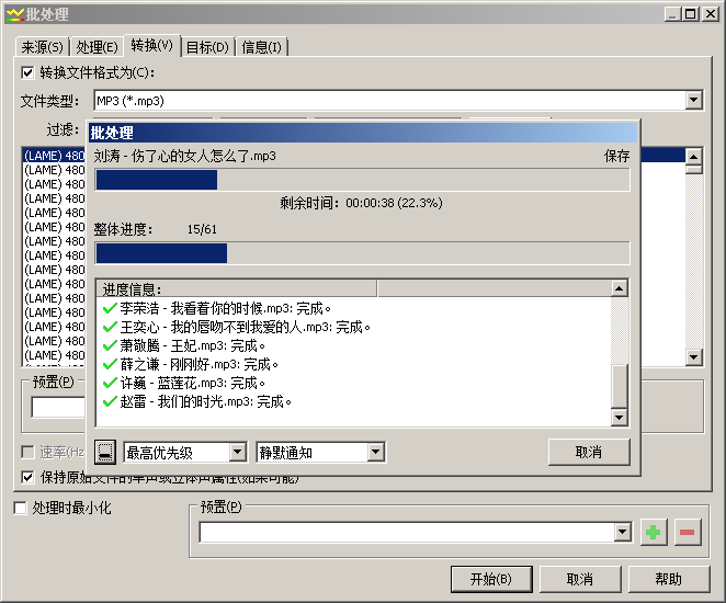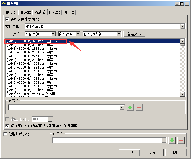 點擊開始就可以看到如下界面,選擇 hz kbps 最大的 立體聲,所以選擇第一個