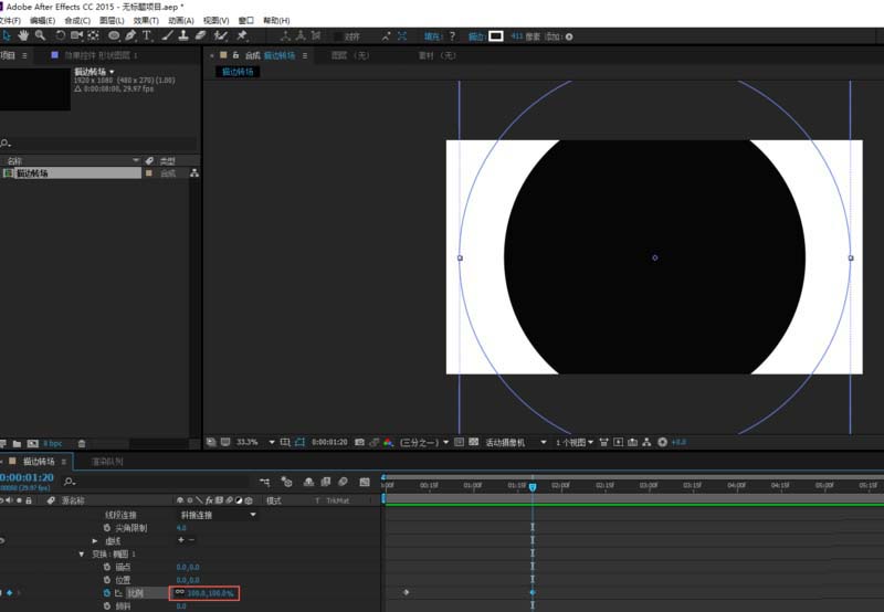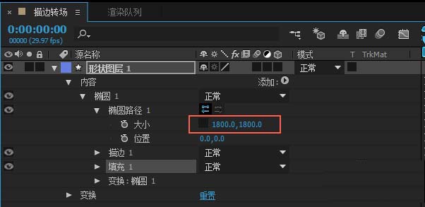 2、雙擊橢圓工具新建一個橢圓,設置橢圓的大小為1800并刪除填充;為描邊的寬度建立關鍵幀;