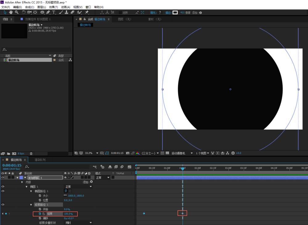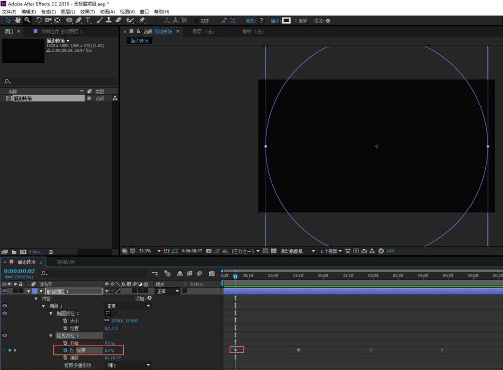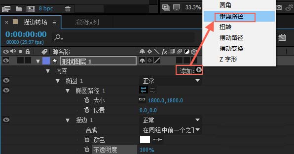 3、單擊形狀圖層旁的【添加】按鈕,給新裝圖層添加修剪路徑;并給【修剪路徑】的結束打上關鍵幀;將【描邊】屬性的線段端點修改成"圓頭端點';