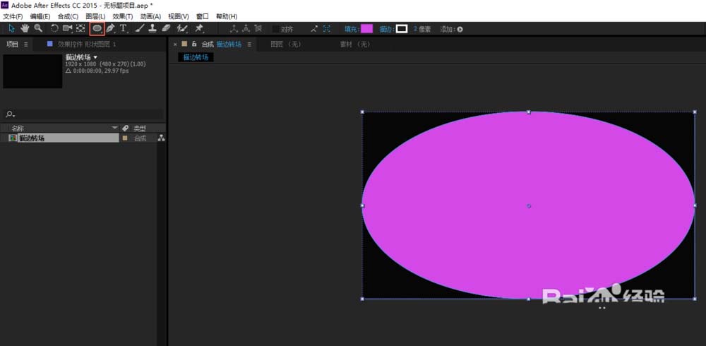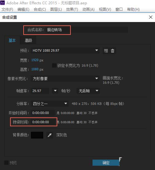1、打開AE新建項目并新建合成,設置合成的名稱為"描邊轉場"、合成的大小為1980*1080、合成的持續時間為8秒;