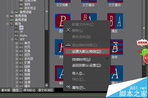 4、在特效 轉場-2D-圓形 上單擊鼠標右鍵,在彈出的右鍵菜單中選擇 設置為默認轉場效果。