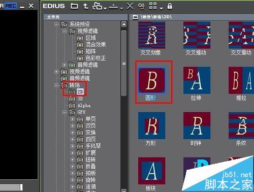 3、在特效面板中找到 轉場-2D-圓形 特效。