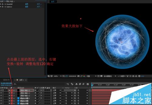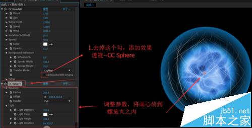 14、勾選掉CC Rainfall效果當(dāng)中的 compposite with origina 前面的小對勾,這樣就和前面的圖片融合到一起了,讓前面添加的顆粒變成球形 添加 CC Sphere 是在效果的透視當(dāng)中調(diào)整參數(shù),可以參考圖片