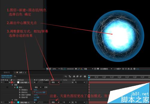 18、此時(shí)已經(jīng)看出了螺旋丸的輪廓,不過還不太像我們加深下圓心質(zhì)感,更逼真新建一個天藍(lán)色固態(tài)層(圖中是青色),按住AIT在中心畫一個小圓調(diào)整羽化參數(shù)和疊加模式,大家參考圖片