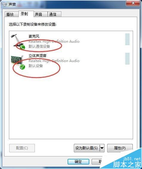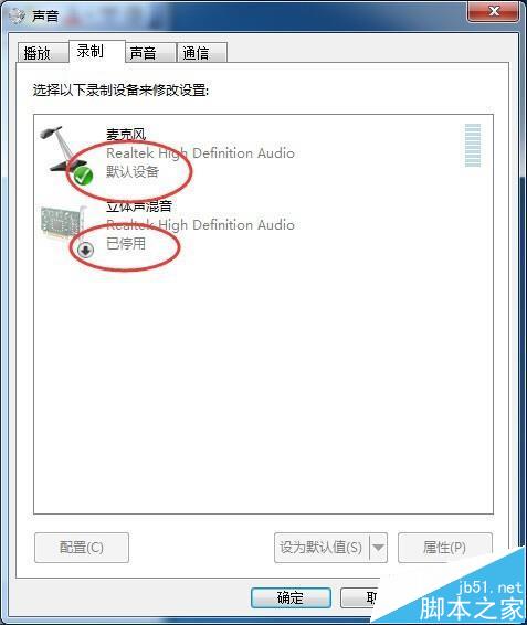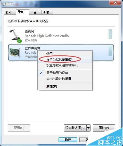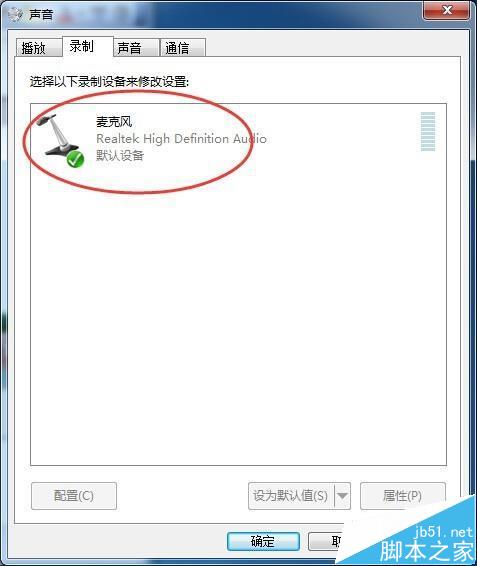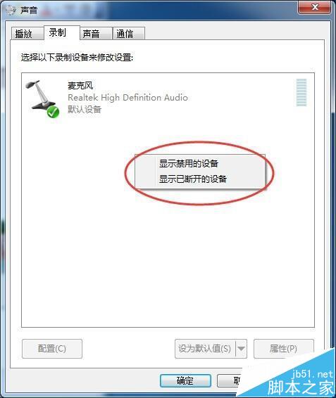 3、在聲音選項卡里點擊錄制,這里只能看到麥克風,而且被設置為默認設備。