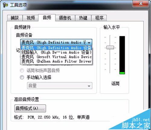 3、彈出對話框后我們選擇音頻項,將聲音輸入設(shè)備設(shè)置為AV開頭的聲卡,然后點擊確定