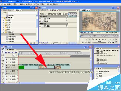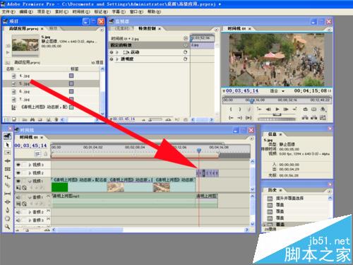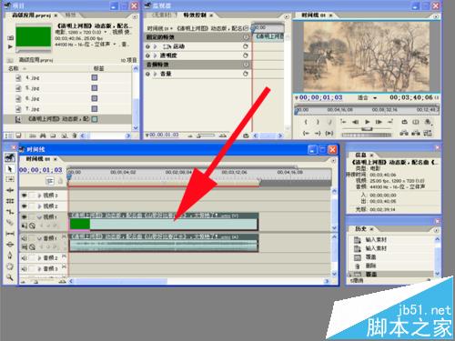 5、從項目中找到一個具體的素材按住鼠標左鍵拖拽到相應的軌道上,視頻拖拽到視頻軌道,音頻拖拽到音頻軌道上。在這里我們先把視頻拖拽到視頻軌道上。