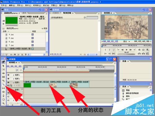 7、如果需要對視頻進行截取,選擇工具箱里的剃刀工具,在需要截取的的地方點擊即可把視頻進行分段。
