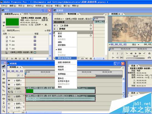 6、現(xiàn)在就可以對視頻進行編輯了,如果不需要原來的聲音我們可以分離后刪除,在視頻軌道上右鍵單擊從下拉菜單中選擇解除音視頻鏈接選項,這樣音視頻就分開了,選擇音頻按delete刪除即可。