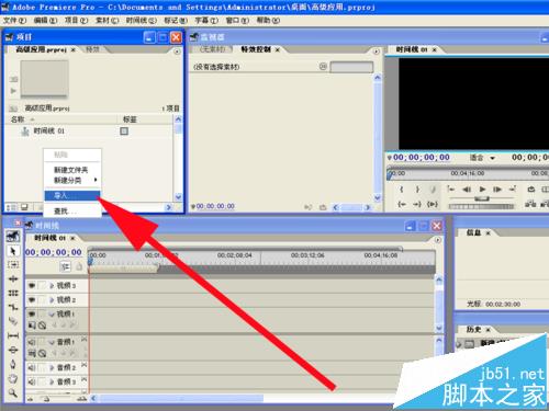 4、接著進入主界面,在項目中右鍵單擊從下拉菜單中選擇導入選項,打開位置對話框從中選擇需要導入的素材。