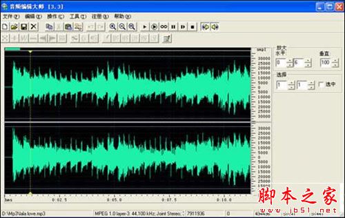 單擊“打開”按鈕以后,將音頻文件導入到音頻編輯大師界面當中,以雙聲道的音頻顯示在音頻編輯大師的編輯界面當中。如圖6所示。