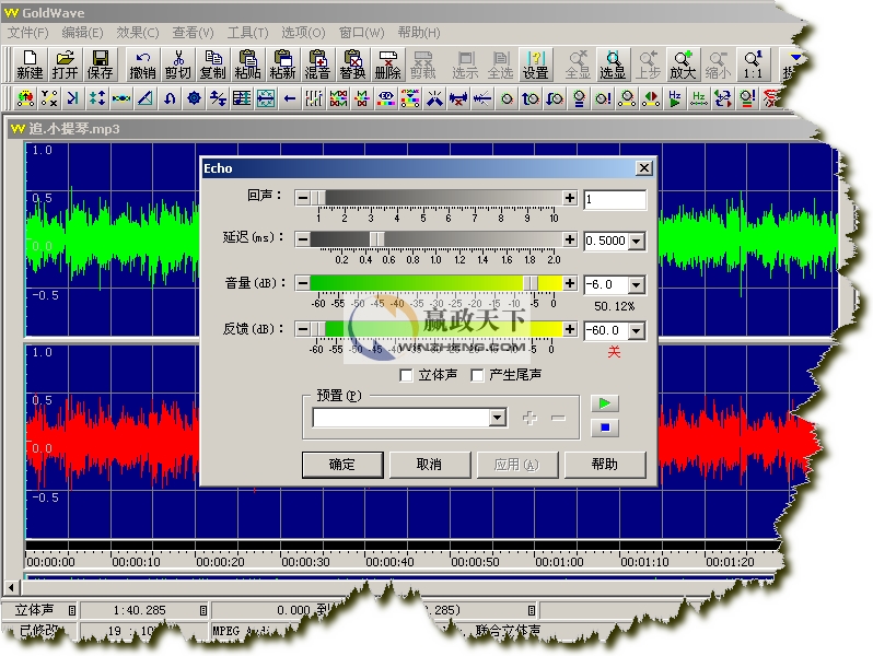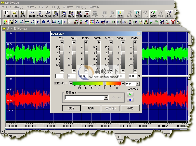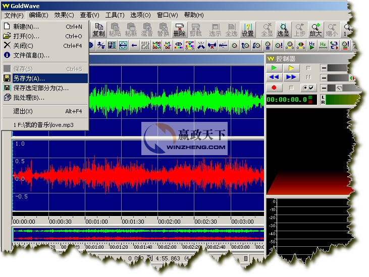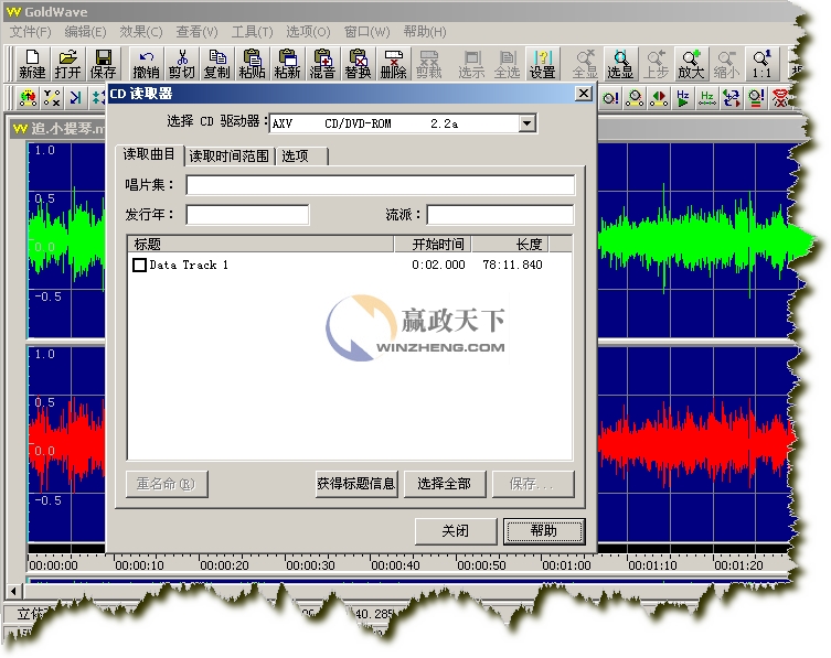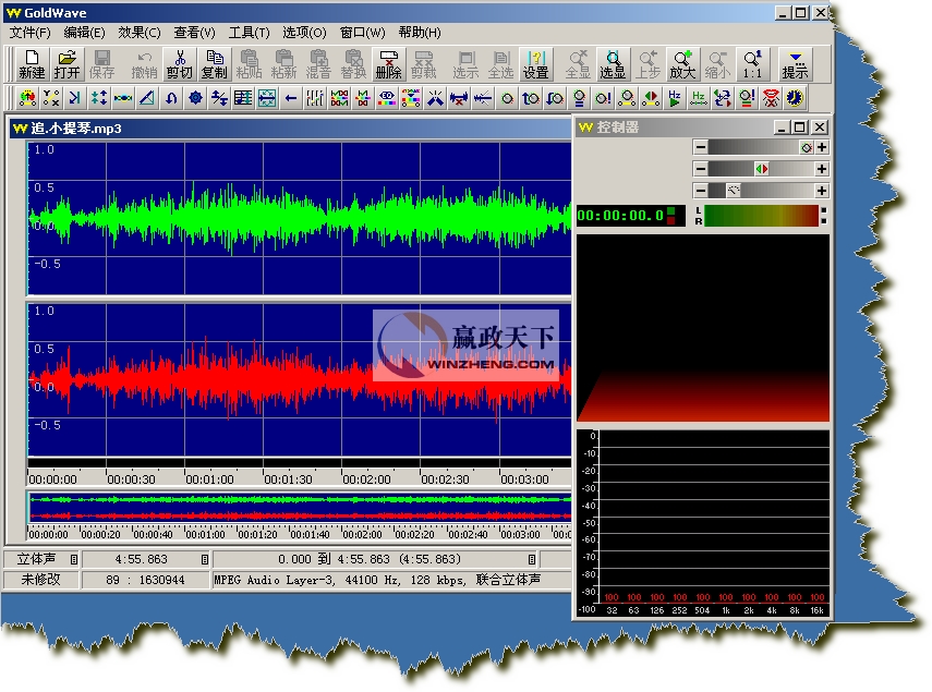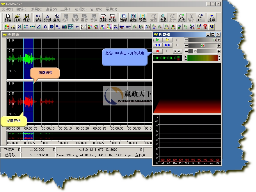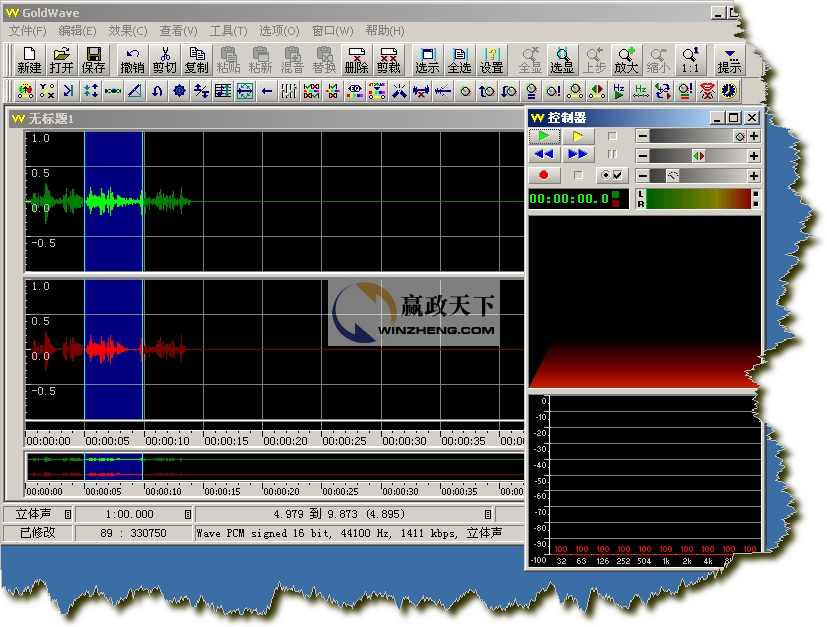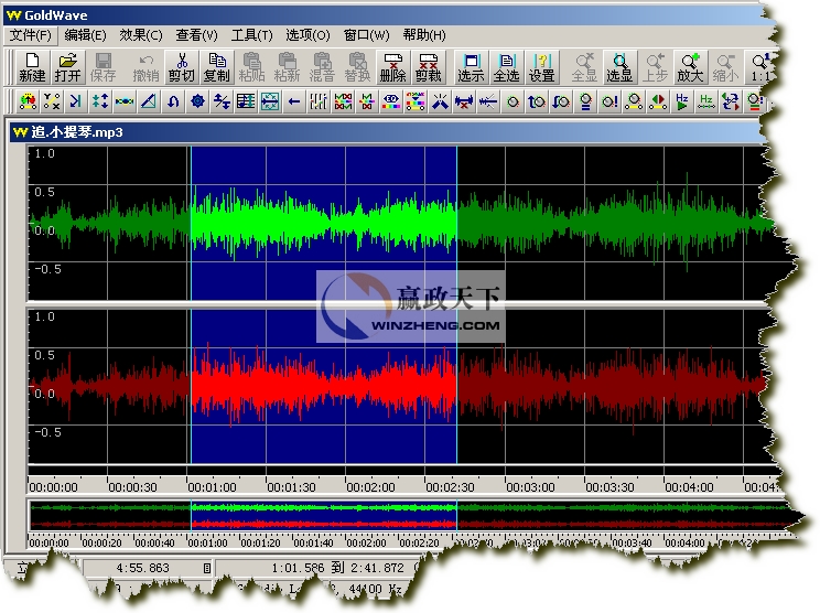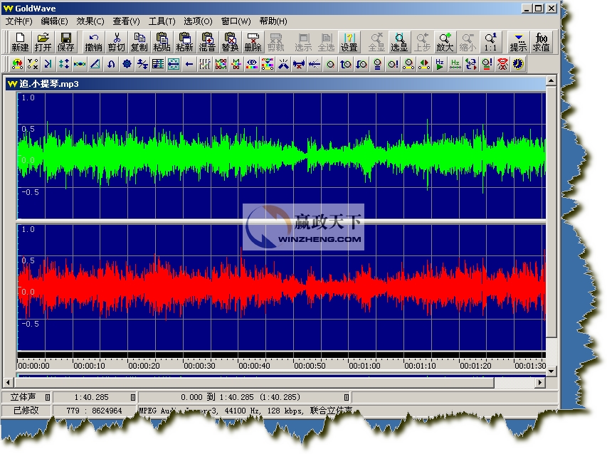 我們打開的是一個立體聲文件,所以GoldWave會分別顯示兩個聲道的波形,綠色部分代表左聲道,紅色部分代表右聲道