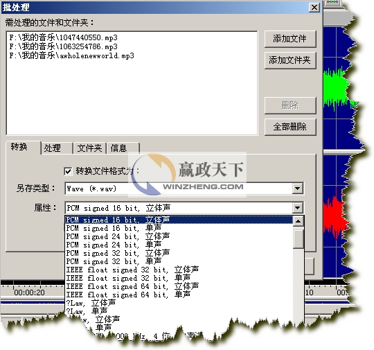 * 批轉換命令可以把一組聲音文件轉換為不同的格式和類型。該功能可以轉換立體聲為單聲道,轉換8位聲音到16位聲音,或者是文件類型支持的任意屬性的組合。如果安裝了MPEG多媒體數字信號編解碼器,還可以把原有的聲音文件壓縮為MP3的格式,在保持出色的聲音質量的前提下使聲音文件的尺寸縮小為原有尺寸的十分之一左右;