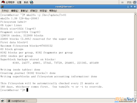 7、使用mkfs /dev/vgdate/lv01命令格式化lv01