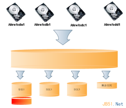 由N個磁盤可以組成一個很大的空間VG1,然后從VG1上面劃分需要使用的分區。