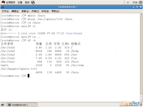 8、Linux下的文件系統需要被掛載之后才能使用,我們先使用mkdir /date 命令創建一個空目錄,然后用 mount /deta/vgdate/lv01 /date 命令將我們的lv01分區掛載到/date目錄下,至此我們新創建的lv就可以使用了。
