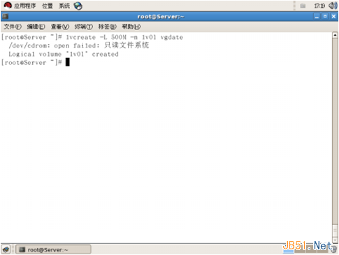 6、用lvcreate –L 500M –n lv01 vgdate 命令從VG vgdate中創建一個大小為500M的名為lv01的LV