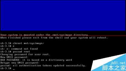 7、輸入如下類容表示進(jìn)行root密碼的更改,我們可以看到提示了個(gè)update successfully表示修改成功,然后輸入reboot重啟,就會(huì)進(jìn)入到用戶登錄界面,輸入剛才修改的密碼就可以登陸了