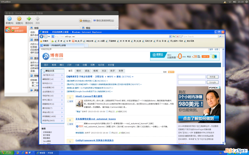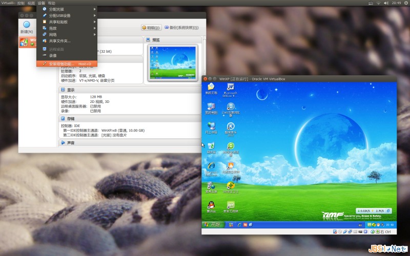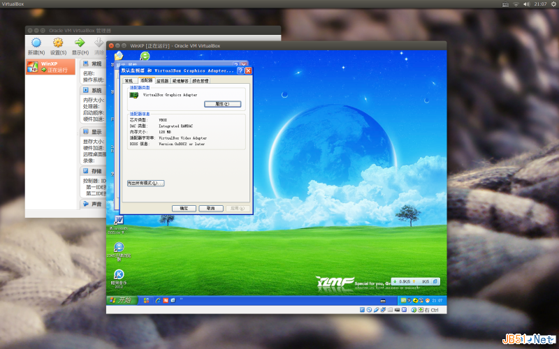 按Host+L鍵,可以鍵入無縫模式,如下圖,可以看到在Ubuntu系統中,Ubuntu風格的窗口和WinXP風格的窗口共存:
