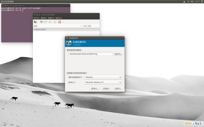 該軟件可自動識別系統中的虛擬機環境是QEMU+KVM還是Xen。新建一個虛擬機,由于之前安裝過一個WinXP系統,所以選擇導入現有硬盤鏡像。點下一步后,出現如下界面: