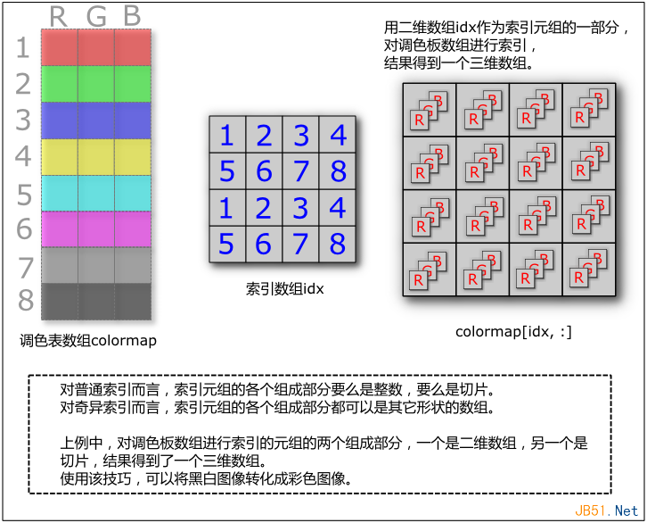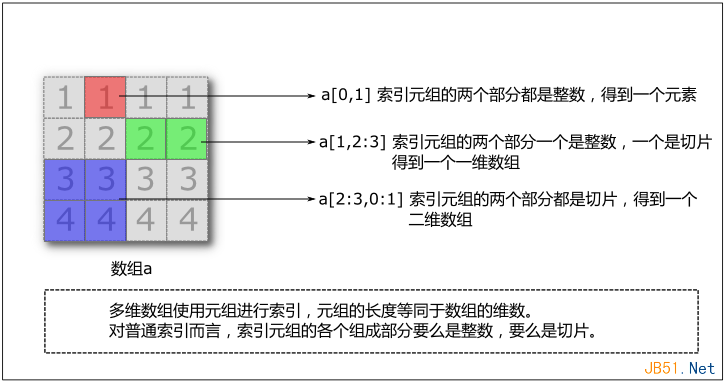 前面提到,對多維數(shù)組進(jìn)行索引的時(shí)候需要用到元組,元組的長度等同于數(shù)組的維數(shù)。對于普通索引而言,元組的各個(gè)部分要么是整數(shù),要么是切片。而對于奇異索引而言,索引元組的各個(gè)組成部分都可能是多維數(shù)組或者切片。如果是多維數(shù)組,則最后得到的數(shù)組的形狀和索引數(shù)組的形狀相同,如果配合切片,則可能得到更高維的數(shù)組。如下圖:
