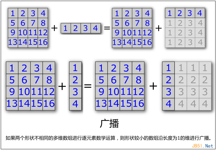 不用擔(dān)心,在面向數(shù)值計(jì)算的語言中,一般都有“廣播”這樣一個(gè)特性。當(dāng)兩個(gè)數(shù)組的形狀不一樣時(shí),形狀比較小的那個(gè)往往可以在長度為1的維度上進(jìn)行廣播。如下圖: